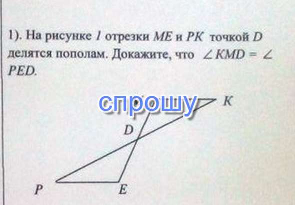 Тр DMK = тр DEP по 1 признаку, следовательно равны все элементы, следовательно уг. KMD = уг. PED