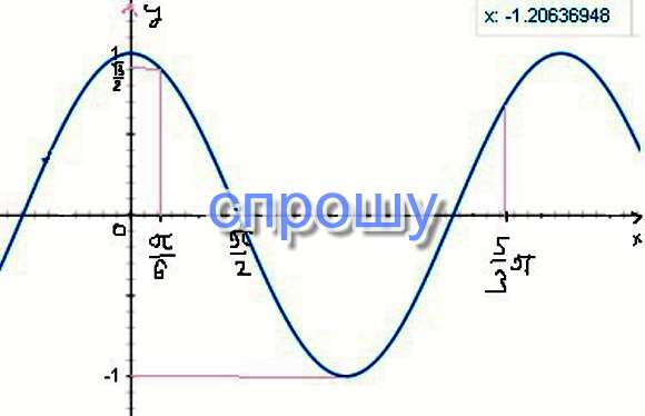 Найдите наименьшее и наибольшее значение функций y = cos на отрезок п на 6 и 5п на 3