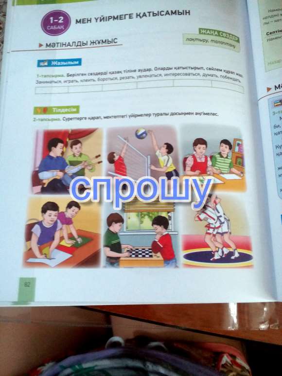 Мен досым Айдоспен домбыра үйірмесіне қатысамын. Ержан мен Айдар доппен волейбол ойнап жүр. Мен ініммен шыршаның суретін салдым. Біз еңбек сабағында қайшымен матаны қидық. Мен досыммен шахмат ойнадым. Олар күреспен айналысады.