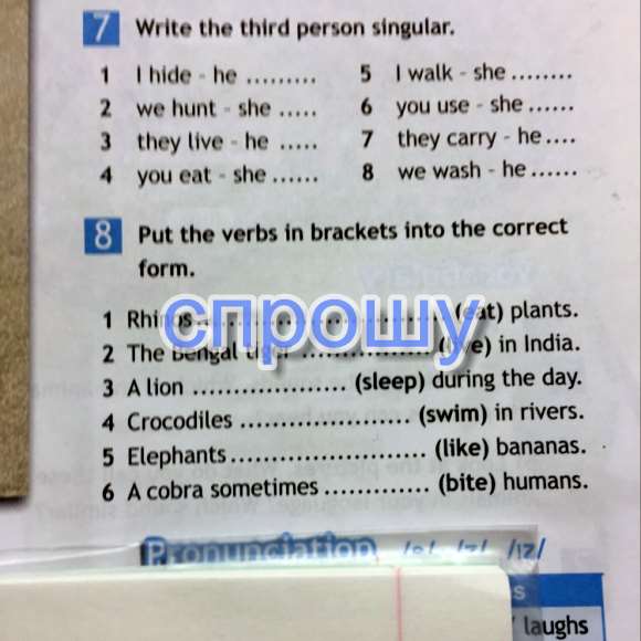 Написать третьего лица единственного числа 1 Я скрываю 5 HE Я хожу она 2 мы охотимся она 6 вы используете она 3 они живут HE 7 они несут He 4 вы едите, она 8 промываем он E8 положить глаголы в скобках в правильную форму. Носороги ............................... (едят) растения. 1 2 Бенгальский тигр (жить) в Индии 3 лев (сна) в течение дня. 4 Крокодилы (плавать) в реках 5 Elephants (как) бананы. 6 Acobra иногда (укус) люди.
