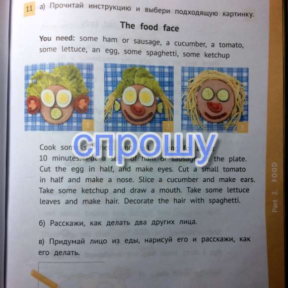 Правильная картинка 2. В тексте говорится, как готовить и что нужно. А нужно там: помидор, яйцо, спагетти, салат, кетчуп. Так, что правильная картинка 2. А ещё тебе просто надо нарисовать лицо из еды, например, как на картинках.