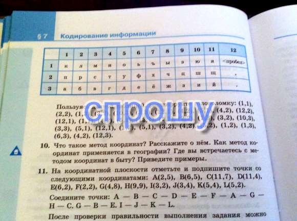 Каждой букве алфавита поставлена в соответствие пара чисел:первое число-номер столбца,а второе - номер строки следующей кодовой таблицы: