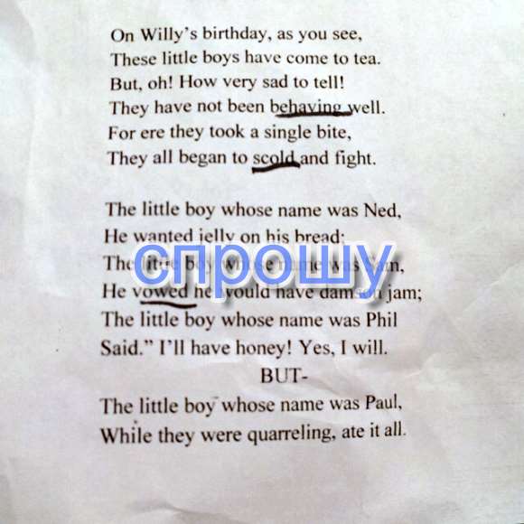 На день рождения Вилли, как вы видите,Эти маленькие мальчики приходили на чай.Но, ах! Как очень грустно говорить!Они не были бы\велл.Для где они взяли один укус,Они все стали ругать и бороться.Маленький мальчик, которого звали нед,Не хотел желе на свой хлеб:Маленький мальчик, которого звали Сэм,Не поклялся бы сливовое вареньеМаленький мальчик, которого звали ФилГоворит - Я буду есть мед! Да, я буду.Но-Маленький мальчик, которого звали Павел,Пока они ссорились, ели. все.