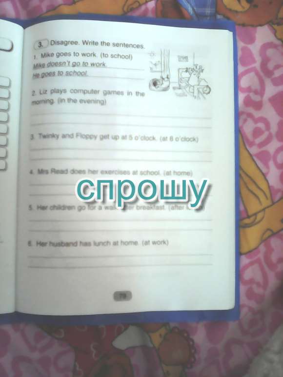 1.Liz doesnt play computer games in the morning. She plays in the evening 2.The havent get up at 5 oclock. They get up at 6 oclock. 3.Her children havent go for a walk after breakfast. They go after lunch. 4.Her husband hasnt lunch at home. He lunch at work.