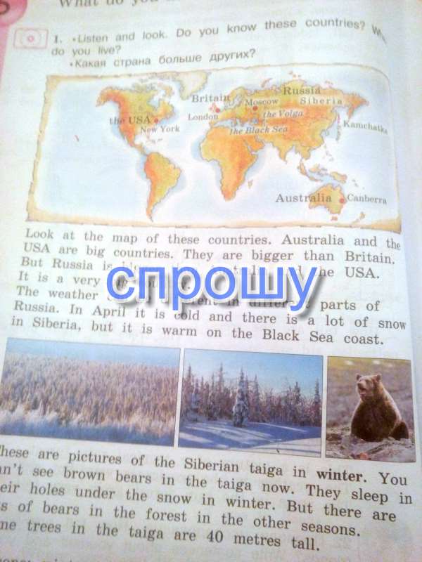 Посмотри на карту этих стран. Австралия и США это большие страны.Они больше чем Британия .Но Россия больше чем Австралия и США.Это сама большая страна . Погода может быть очень изменчива .В апреле в Сибири холодно и лежит снег ,но тепло в районе Черного моря .на этих картинках Сибирская Тайга зимой .Ты не можешь увидеть бурого медведя сейчас .Они спят под снегом всю зиму.... простите дальше на фото обрезаны предложения