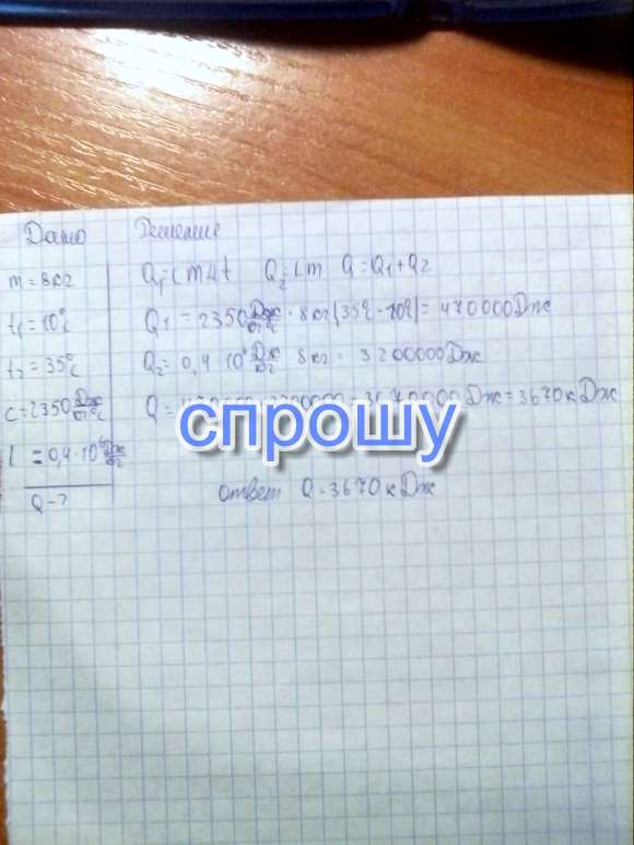 Определите количество теплоты, необходимое для обращения в пар 8 кг эфира, взятого при температуре 10 градусов. Пожалуйста помогите мне. Должно быть ДАНО и РЕШЕНИЕ.