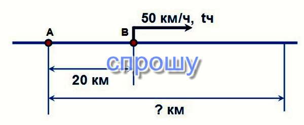 Автомобиль проехал 20 км, а затем продолжил движение в том же направлении в течение t час со скоростью 50 км/ч. Найти общий путь, пройденный автомобилем.