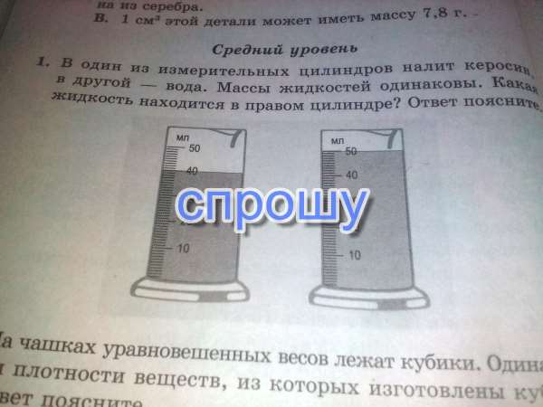 В правом цилиндре находиться керосин, т.к. его плотносттность меньше чем у воды, а их масса по условию одинакова, значит что бы добиться одинаковой массы пришлось его налить больше чем воды. (Плотность керосина - 800кг/м3, а плотность воды - 1000 кг/м3)