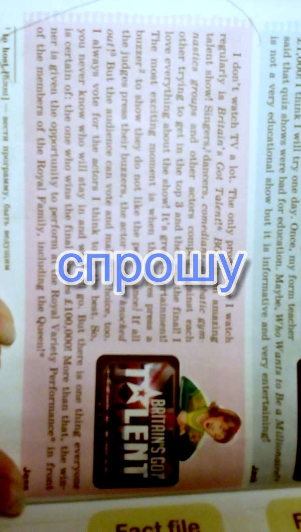 Я ТВ много не смотрю.Только одно программа,наблюдаемая мной регулярно-это britains got talent!Это замечательное шоу талантов.Певцы,танцоры,комики,акробаты и гимнастические группы,а также другие борются друг с другом,пытаясь войтив топ 3 и выиграть финал!Я люблю всё связанное с этим шоу!Это прекрасная развлекательная программа!Самый восхитительный момент это когда судьи нажимают сирену(),чтобы показать,что им не понравилось представление.