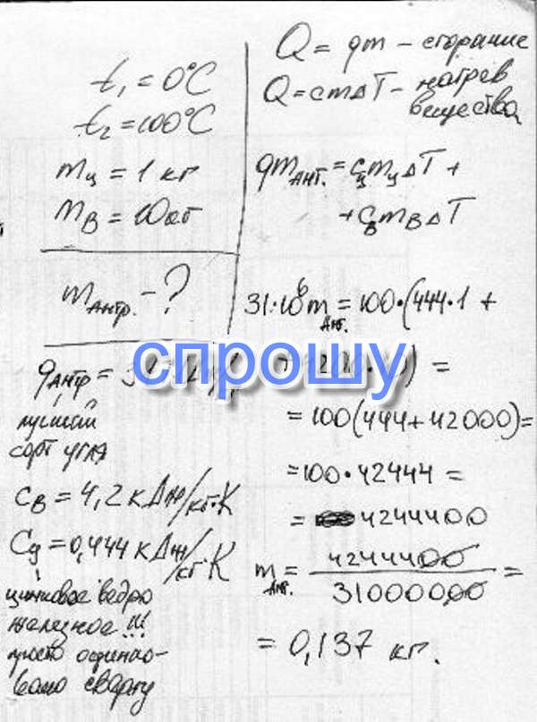 Сколько нужно сжечь антрацита, чтобы нагреть цинковое ведро с водой от 0° до 100°. Масса ведра = 1 кг, объем = 10 л, удельная теплоемкость антрацита 27 МДж/кг.