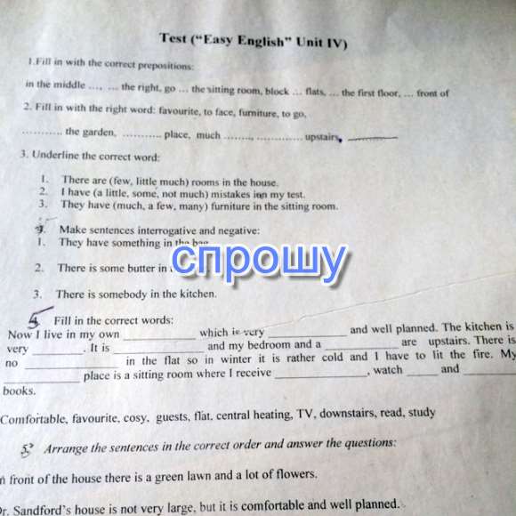 5) flat, comfortable, cosy, downstairs, study, central heating, favourite, guests, TV, read
