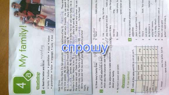 Привет,я Эми Кларк.Мне 10 лет.Это фотография моей семьи.Они очень хорошие люди. Мой отец Майк.Ему 36 лет и он очень дружелюбный.Он может говорить на двух языках-Английском и Французском.Джанис моя мама.Ей 35 и она очень вежливый человек.Моего дедушку зовут Гэри. Ему 62 и он очень веселый(смешной).Он папа моей мамы. Нэнси моя бабушка. Ей 59 и она очень хорошо играет на пианино. Джесси это мой маленький брат.Ему 8 и он очень умный.Он,также,может быть немного сумасшедшим.моя семья чудесная и мне с ними очень повезло.