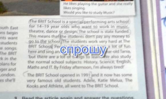 Перерыв на обед в БРИТ школе, На юго-востоке Лондона и час прежде чем занятия снова начнутся. Однако, в этой школе, студенты хотят учится в течении обеденного перерыва. Некоторые студенты обычно играют вместе на гитаре и пишут песни. Другие студенты практикуют танцевальные движения. Студенты БРИТ школы любят делать свою домашнюю работу в библиотеке и разговаривать о своих мечтах и планах на будущее. Фрейя думает что будет певицей и звездой в известных мюзиклах на западном конце Лондона. Билл думает он будет звездой мыльных опер а Таня надеется что будет успешной актрисой. БРИТ это школа особенного испольнительского искусства для подростков 14-19 лет которые хотят работать в музыке, театре, танцах или дизайне. Школа финансируется государством. Это означает что студенты не платят за посещение школы. Студенты работают очень усердно в БРИТ школе. "Люди думают что у нас тут много веселья, песни и танцы целый день" говорит 16-летняя Таня."но есть много вещей которые нужно знать. Мы также изучаем обычные школьные предметы. История, наука, английский, математика и IT. К полудню пятницы я всегда уставшая!"
