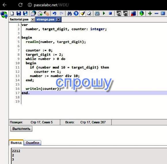 Определить сколько в веденном четырехзначном числе двоек. Через Паскаль, заранее спасибо