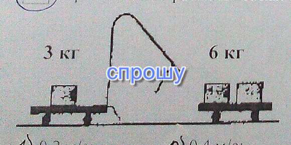 После пережигания нити, удерживающей пружину (см рисунок), левая тележка начала двигаться со скоростью 0,4 м/с. На рисунке указаны массы грузов вместе с тележками. С какой по модулю скоростью будет двигаться правая тележка?