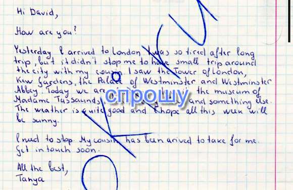 вчера я приехала в Лондон. я была очень уставшей но это меня когда я пошла не много погулять по городу с с кузеном. я увидела башню Лондона, кеу агароды, дворец вестминистер, и вестминистер аби. сегодня мы планируем пойти в музей мадамы тусордз, национальную галерею и куда нибудь еще. пока что погода довольно хорошая, я надеюсь что вся неделя будет солнечной.