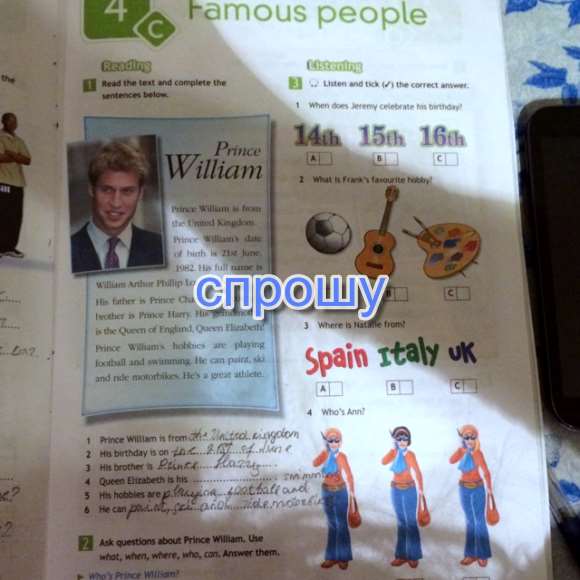 В 1 надо прочитать текст и дополнить предложения под текстом.В третьем нужно прослушать запись на диске который шел в комплекте с учебником и отметить вариант ответа.