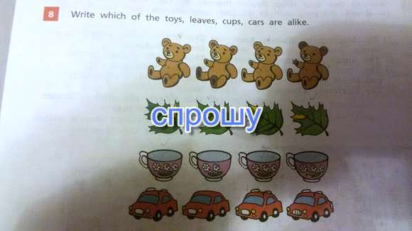 Помогите пожалуйста Напишите на английском, какие из игрушек, листьев, чашек, автомобили одинаковы.