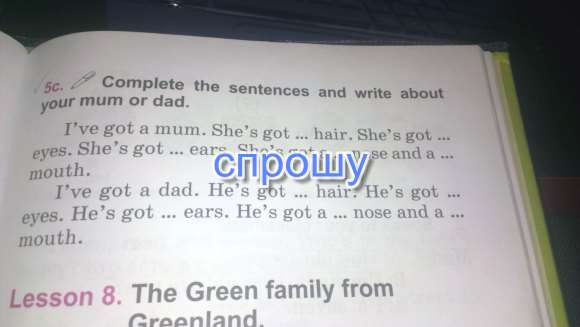 He has got a blond hair. He has got a green eyes. He has got a small ears. He has got a big nose and a (то же самое) mouth.