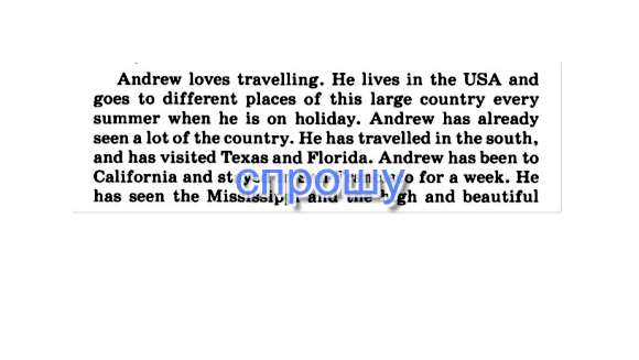 Андрей любит путешествовать. Он живет в США и посещает различные места этой огромной страны каждое лето когда он на отпуске. Андрей уже видел множество стран. Он ездил на юг и побывал в Техасе и Флориде. Андрей был в Калифорнии и оставался в Сан-Франциско на неделю. Он видел Миссисипи и высокий и красивый...