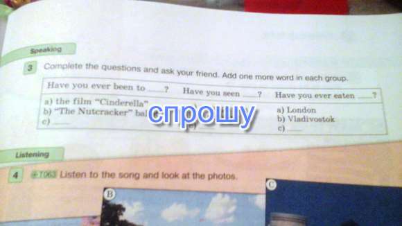Have you ever been to London/Vladivostok/Moscow Have you seen the film "Cinderella"/"The Nutcracker" ballet/me yeasteday Have you ever eaten an apple pie/a pudding/a pizza