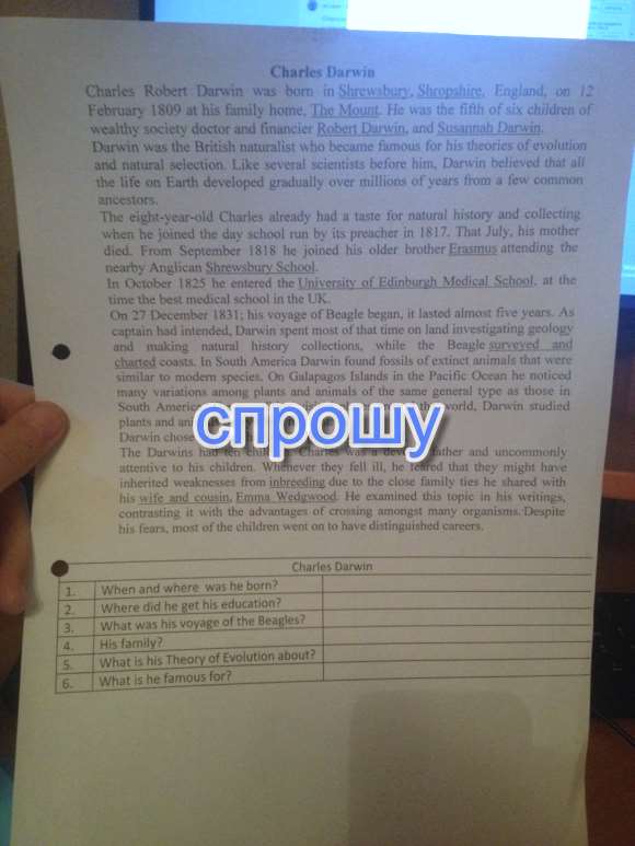 Чарльз Роберт Дарвин был в Шрусбери, родившихся, Шропшир, Англия, 1 февраля 1809 года в своем доме, на гору. Он был пятым из шести детей богатого доктора общества и финансиста Роберта Дарвина и Сюзанны Дарвина. Дарвин был британским натуралистом, который стал известен своей теорией эволюции и естественного отбора. Как и некоторые ученые до него, Дарвин полагал, что вся жизнь на Земле развивалась постепенно в течение миллионов лет из нескольких общих восьмилетней давности Чарльз уже имел вкус к естественной истории и сбора, когда он вступил в дневную школу в ведении своего проповедника в 1817 г. в июле этого года, его мать умерла. С сентября 1818 года он присоединился к своему старшему брату Erasmus посещать близлежащие англиканскую Шрусбери школы. В октябре 1825 года он поступил в Эдинбургский университет Medieal школы. в то время лучший медицинской школы в Великобритании 27 декабря 1831 года; его плавание Бигль началась, она длилась почти пять лет. Как капитан намеревался, Дарвин провел большую часть времени на земле, исследуя геологии и делая коллекций естественной истории, в то время как Beagle обследоваться и наметил побережий. В Южной Америке Дарвин обнаружил окаменелости вымерших животных, которые были похожи на модем видов. На Галапагосских островах в Тихом океане, он заметил множество вариаций среди растений и животных одного и того же общего типа, что и в Южной Америке. В экспедиции посетили места по всему миру, Дарвин изучал растения и животных во всем мире он пошел Дарвин решил жениться на своей двоюродной сестре, Эмм Веджвуд. В Дарвины было десять детей. Чарльз был преданным отцом и uncommonl внимательными к своим детям. Всякий раз, когда они заболевали, он опасался, что они, возможно, унаследовали от слабости инбридинга из-за тесных семейных связей он поделился со своей женой и кузеном, Эмма Веджвуд. Он осмотрел его труды контрасту с преимуществами скрещивания среди многих организмов. Несмотря на свои страхи, большинство детей пошли дальше иметь выдающиеся карьеры.