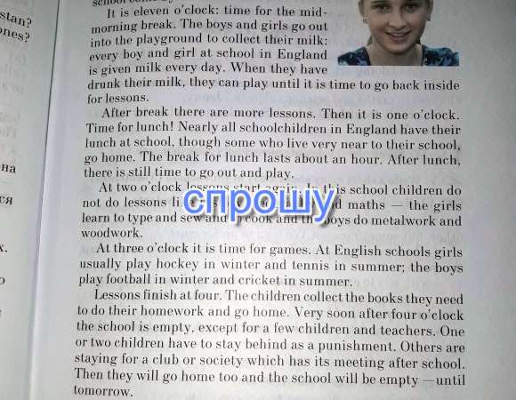 это 11:00: Линия для середины утреннего перерыва. Мальчики и девочки из гу в детскую площадку cullect их молока каждый мальчик и девочка в школе в Энглунд дается молоко каждый день. Когда у них есть свое молоко, они могут играть Уриил настало время, чтобы вернуться внутрь для уроков После перерыва здесь больше уроков. Тогда ил, является одним oclork. Время обеда Lur! Почти все hoolrhildren в Англии имеют свой крен в школе, хотя некоторые, кто живет vrry рядом с их школой. иди домой. Hreak на обед длится Абуль часа. Aiter обед есть еще litue о ОНР идти и играть. Al чюо часов меньше slarl снова, В этой школе childreu дю не делать уроки, как истории, географии и математике девушки научиться печатать и шить и готовить и Loys делать металлические изделия и изделия из дерева На Thr я clof K настало время для игр , На Englis Hools девушки пенно играть замок у зимой Āne тенниса в sumiller; ТНР мальчики играют дурак мяч будет Лер anderirket летом, Lessone Finis! л аль luur. Я LIIT ildren COLLEC книги lhey MEED ло сделать свою домашнюю работу домой. Очень скоро после того, как четыре nelock школа emply. xcept в течение нескольких детей и Ли achers. Один или двое детей должны остаться в качестве наказания rient. Другие заколающие для клуба или общества, которое имеет свою weeting после школы Тогда EY будет идти домой тоже, и школа будет пустым до