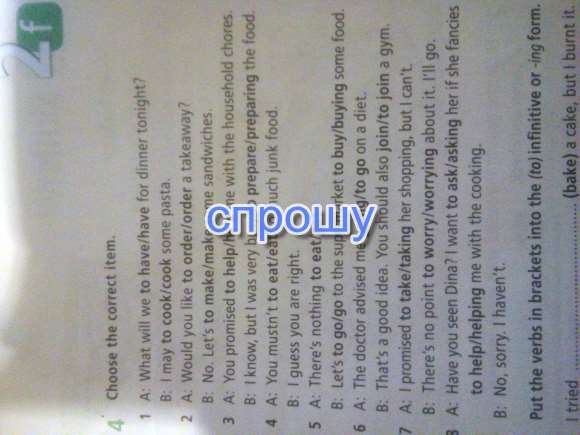 Что будет у нас иметь / есть сегодня на ужин Я могу приготовить макароны. Вы хотите заказать еду на дом Нет. Давайте делать / сделать некоторые бутерброды вы обещали помочь / мне помочь с домашними делами. знаю, но был очень занят, чтобы подготовить / приготовления пищи Вы не должны съесть / съесть так много нездоровой пищи, я думаю, вы правы. Там нет ничего, чтобы поесть / поесть. Давайте идти / пойти в супермаркет, чтобы купить / покупать некоторые продукты питания. Врач посоветовал мне идти / пойти на диете, что это хорошая идея. Вы должны также присоединиться к / присоединиться к тренажерный зал. Я обещал принять / принимать ее покупки, но я не могу. Там нет никакого смысла worrylworrying об этом. Я пойду. Вы видели Дину хочу спросить / спрашивая ее, если она воображает