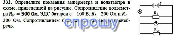 схеме, приведенной на рисунке. Сопротивление вольтметра Rv = 500 Oм , ЭДС батареи ε = 100 В, R1 = 200 Ом и R2 = 300 Ом. Сопротивлением батареи и амперметра пренебречь.