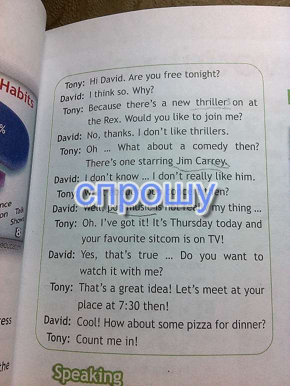 Тони: Привет Дэвид. Ты свободен вечером Дэвид: Я так думаю. Зачем Тони: Потому что есть новый триллер о в Rex. Не хотели бы вы присоединиться ко мне Дэвид: Нет, спасибо. Я не люблю триллеры. Тони: На что насчет комедии тогда Там один в ролях: Джим Кэрри, Дэвид: я не знаю, на самом деле не похож на него Тони: А как насчет поп-концерта тогда Дэвид: Ну, поп-музыка не совсем моя вещь, Тони: Да, я получил его! Сегодня четверг сегодня Ваш любимый ситком по телевизору! Дэвид: Да, это правда, что вы хотите т посмотреть его со мной Тони: Это отличная идея! Давайте встретимся у вас место в 7.30 тогда! Дэвид: Cool! Как насчет пиццы для dinne Тони: Подсчитайте меня