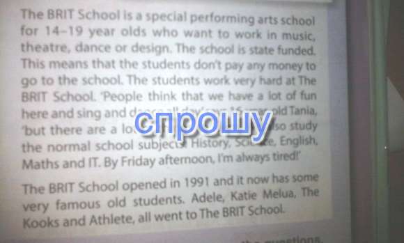 BRIT School является специальным исполнительских искусств школа для 14-19-летних, которые хотят работать в области музыки, театра, танца или дизайна. Школа финансируется государством. Это означает, что студенты не платят никаких денег, чтобы пойти в школу. Студенты работают очень трудно в школе BRIT. Люди думают, что у нас есть много удовольствия здесь и петь и танцевать весь день говорит 16-летний Tania, но есть много вещей, чтобы учиться. Мы также изучаем обычные школьные предметы: история, наука, английский, математику и ИТ. В пятницу во второй половине дня, Я всегда устаю. Брит школа открылась в 1991 году, и теперь он имеет несколько очень известных старых студентов. Адель, Кэти Мелуа, и спортсмен, все прошли обучение в Брит школе.