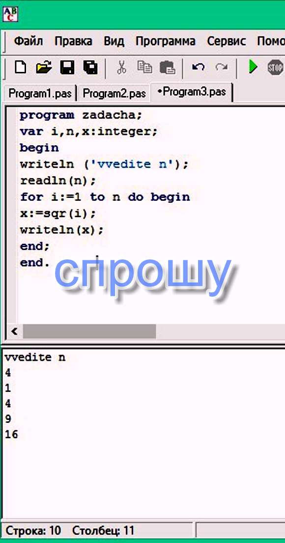 Program zadacha;var i,n,x:integer;beginwriteln (vvedite n);readln(n);for i:=1 to n do beginx:=sqr(i);writeln(x);end;end.