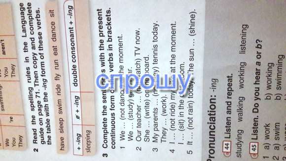 1) We are not (arent) dancing at the moment. 2) We are studying grammar. 3)Our teacher isnt watching TV now. She is writing on the board. 4) My parents arent playing tennis today. They are working. 5) Im not riding my bike at the moment. Im sitting in the classroom. 6) Its not raining today. The sun is shining.