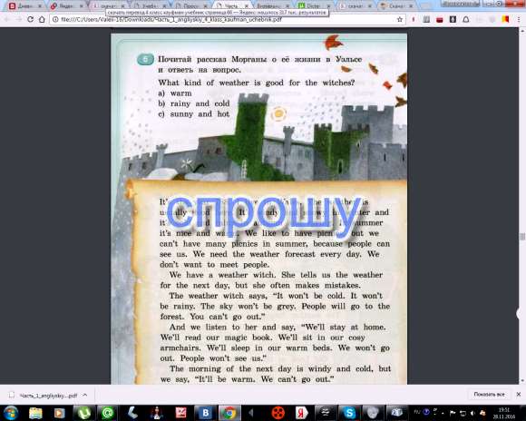 В 788 году я живу в Уэльсе. Погода, как правило, хорошо. Это ветрено и снежно зимой и холодной и дождливой осенью и весной. Летом хорошо и тепло мы любим устраивать пикники, но мы не можем иметь много пикники летом, потому что люди видят, нам нужен прогноз погоды каждый день. Мы не хотим встречаться с людьми. У нас погода ведьма. Она рассказывает нам о погоде на следующий день, но она часто делает ошибки. Погода ведьма говорит, оно не будет холодным. Это не будет дождей. Небо не будет серым. Люди пойдут в лес. Ты не можешь выйти. И мы прислушиваемся к ней и скажи, мы останемся дома. Мы будем читать нашу волшебную книгу. Мы будем сидеть в уютных креслах. Мы будем спать в теплой кровати. Мы не будем выходить. Люди не видят утром следующего дня ветрено и холодно, но мы говорим, это будет теплый. Мы не можем выйти.