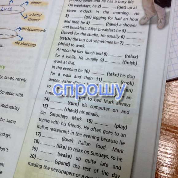 2.gets up, 3.goes, 4.has, 5.catches, 6.leaves,. 7.drives, 8.relaxes,9.finishes, 10.takes, 11.cooks, 12.listens, 13.watches, 14.turns, 15.chacks, 16.plays, 17.loves, 18.likes, 19.wakes, 20.spends