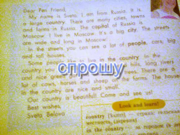 Меня зовут Света.Я из России .Это большая страна.В России много городов.Столица России Москва.Я живу в Москве . Это большой город.В Москве широкие и длинные улицы.На улицах ты можешь видеть много людей,машин,маленьких и больших домов.Некоторые любят жить в сельской местности.Там ты можешь увидеть зелёные поля и холмы,длинные реки и красивые сады с яблонями.Там много коров овец и лошадей на фермах.Дома в сельской местности красивые и маленькие.