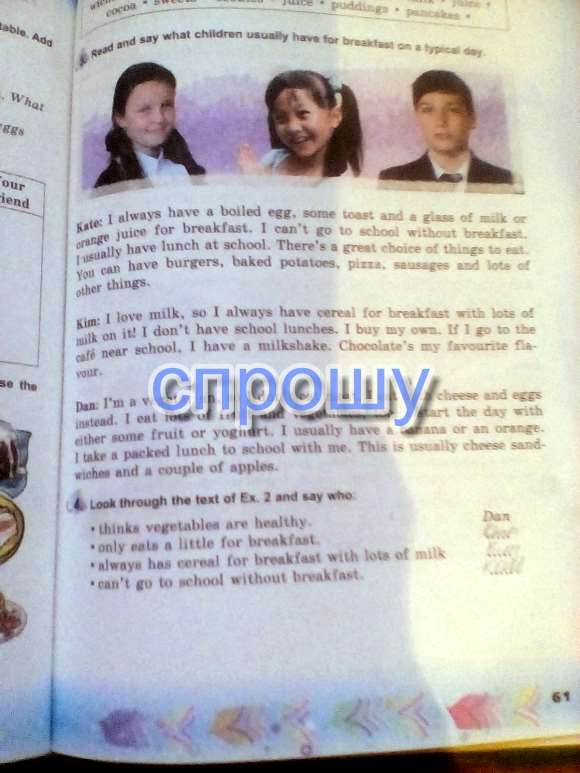 Кейт: у меня всегда есть вареные яйца, тосты и стакан молока или апельсинового сока на завтрак. Я не могу пойти в школу без завтрака. Я обычно обедают в школе. Там большой выбор вещей, чтобы поесть. Вы можете есть гамбургеры, печеный картофель, пиццу, колбаски и многое другое. Ким: я люблю молоко, поэтому у меня всегда есть хлопья на завтрак с большим количеством молока на это! У меня нет школьных обедов. Я покупаю мои собственные. Если я захожу в кафе рядом со школой, у меня есть молочный коктейль. Мой любимый вкус шоколада. Дэн: я вегетарианец, поэтому я не ем мясо. Я ем, а не как сыр и яйца. Я ем много фруктов и овощей тоже. Я начинаю день с фруктов или йогурт, я обычно съедаю банан или Апельсин. Я беру с собой упакованный ланч в школу со мной. Обычно это бутерброды с сыром и пару яблок.