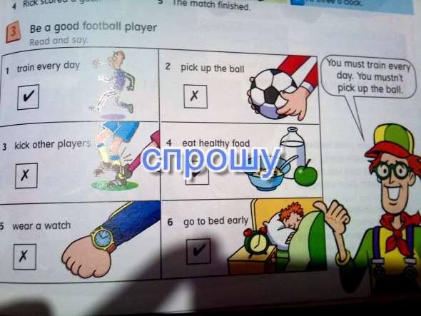 You must train every day. You mustnt pick up the ball. You mustnt kick other players. You must eat healthy food every day. You mustnt wear a watch. You must go to bed early every day.