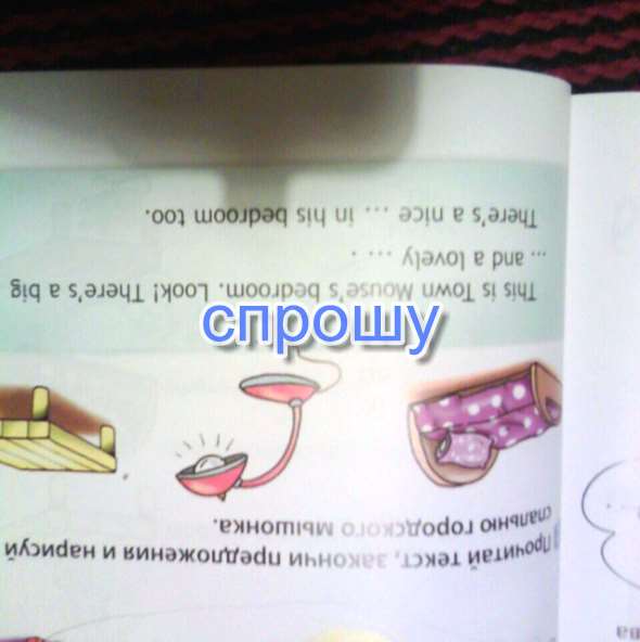 Это спальня городского мышонка. Посмотри! Здесь есть большой стол милая лампа. Здесь также есть прекрасная кровать.