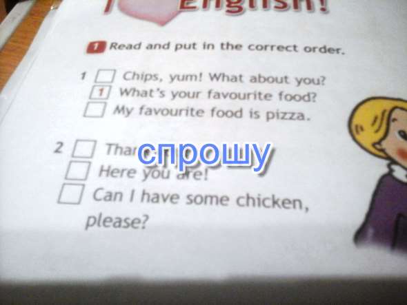 1. 2) Chips, yum! What about you 3)My favourite food is pizza 2. 1)Can I have some chicken, please 2)Here you are! 3)Thank you!