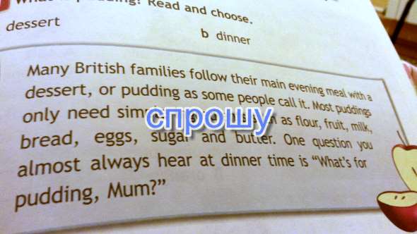 Многие британские семьи следуют их главному блюду с десертом или пудингу, как многие люди называют это. Большинство пудингов нуждается только в простых ингредиентах, таких как: мука, фрукты, молоко, хлеб, яйца, сахар и масло. Один вопрос который ты слышишь почти всегда во время ужина: что для пудинга Мам