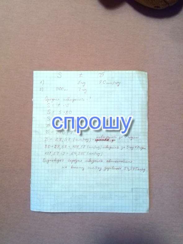 Автомобіль 5 год рухався зі швидкістю 80 км/год а наступні 200 км він проїхав за 7 год Яка середня швидкість руху автомобіля на всьому шляху.