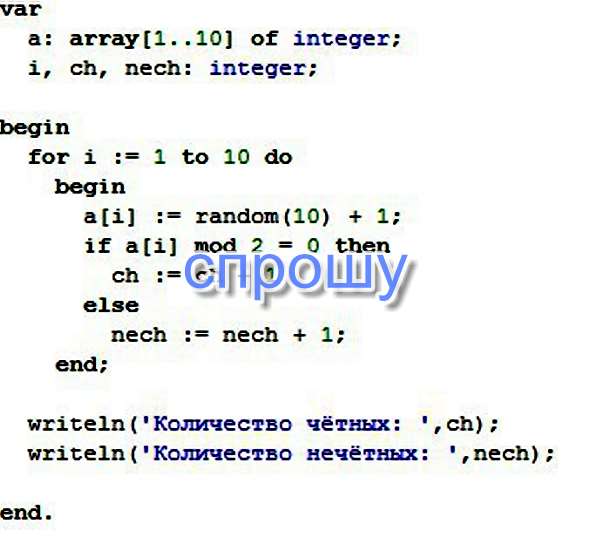 var a: array[1..10] of integer; i, ch, nech: integer; begin for i := 1 to 10 do begin a[i] := random(10) + 1; if a[i] mod 2 = 0 then ch := ch + 1 else nech := nech + 1; end; writeln(Количество чётных: ,ch); writeln(Количество нечётных: ,nech);