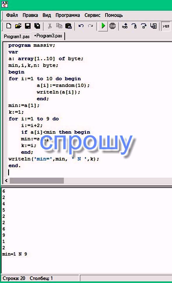 Program massiv;vara: array[1..10] of byte;min,i,k,n: byte;beginfor i:=1 to 10 do begin a[i]:=random(10); writeln(a[i]); end;min:=a[1];k:=1;for i:=1 to 9 do i:=i+2; if a[i]lt;min then begin min:=a[i]; k:=i; end;writeln(min=,min, N ,k);end.