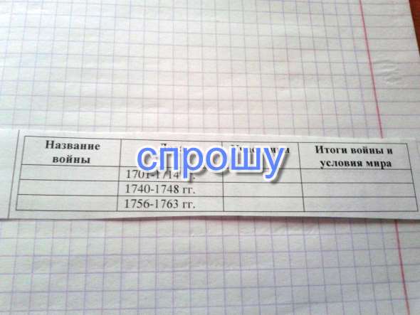 1) Война за Испанское наследство.Война между Францией и Испанией с одной стороны, с другой противостоящей им коалиции во главе с австрийским Габсбургами и Великобританией. Итог:в результате войны престол достался Филиппу Бурбону(внуку французского короля Людовика XIV)