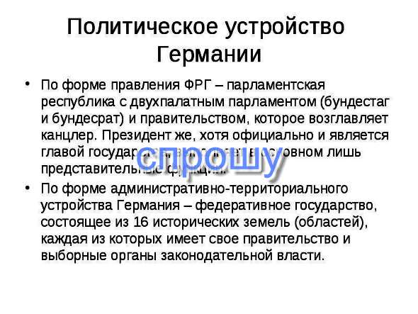 Помогите с историей, вопросы:1) Политическое устройство Германии.2) Причины экономного роста Германии.3) Внутренняя политика .4)Внешняя политика! помогите умоляю!!!