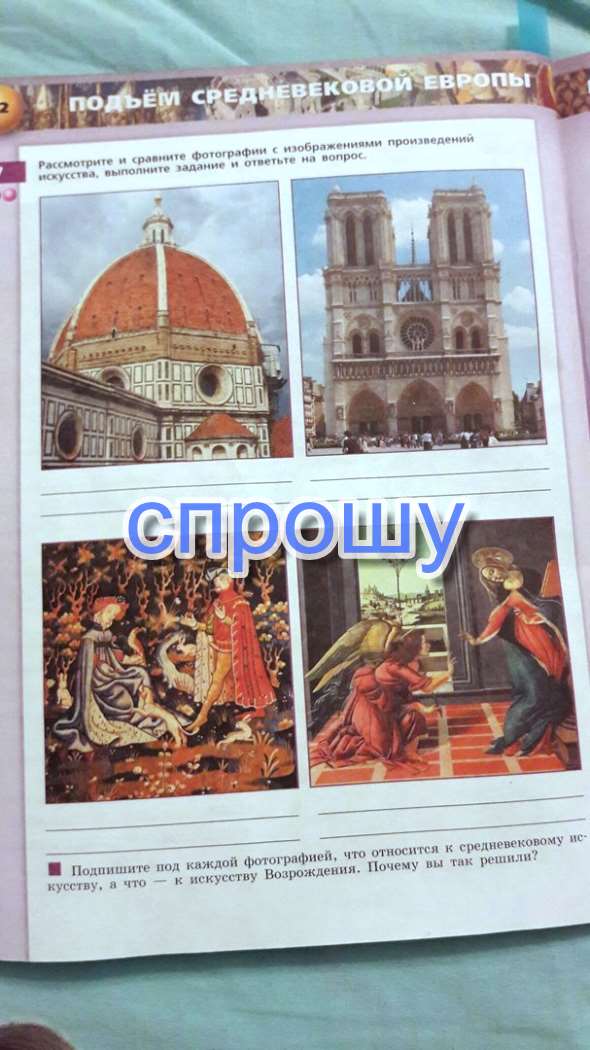"Подпишите под каждой фотографией, что относится к средневековому искусству а что - к искусству Возрождения. Почему вы так решили?"
