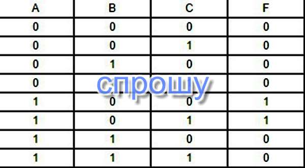 Выписываем из таблицы строки с единичным значением F (потому что таких строк меньше, чем с нулевым). Составляем логическое выражение, отмечая нули инверсией соответствующей переменной и соединяя строки по ИЛИ:
