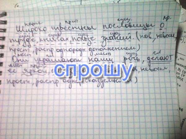 Сделайте синтаксический разбор предложения : Широко известны пословицы о труде,книгах,пользе знаний. Они украшают нашу речь,делают ее яркой ,образной ,живой.