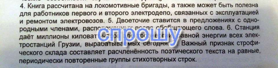 4. Книга рассчитана на локомотивные бригады и работников первого и второго электродепо, связыннных с эксплуатацией и ремонтом электровозов. 5. Двоеточие ставится в предложениях с однородными членами, расположенными после обобщающего слова. 6. Станция даёт миллионы киловатт-часов электроэнергии, равной вырабатываемой сегодня энергии всех электростанций Грузии. 7. Важным признаком строфического склада является расчлененность поэтического текста на равные, периодически повторяемые группы стихотворных строк.